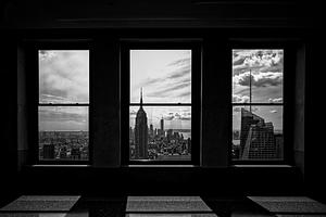Explore iconic NYC vistas in this stunning black and white photograph from the Top of the Rock. Behold the majestic Empire State Building against the southern skyline through a trio of elegant windows. Immerse yourself in timeless urban beauty captured in every detail.